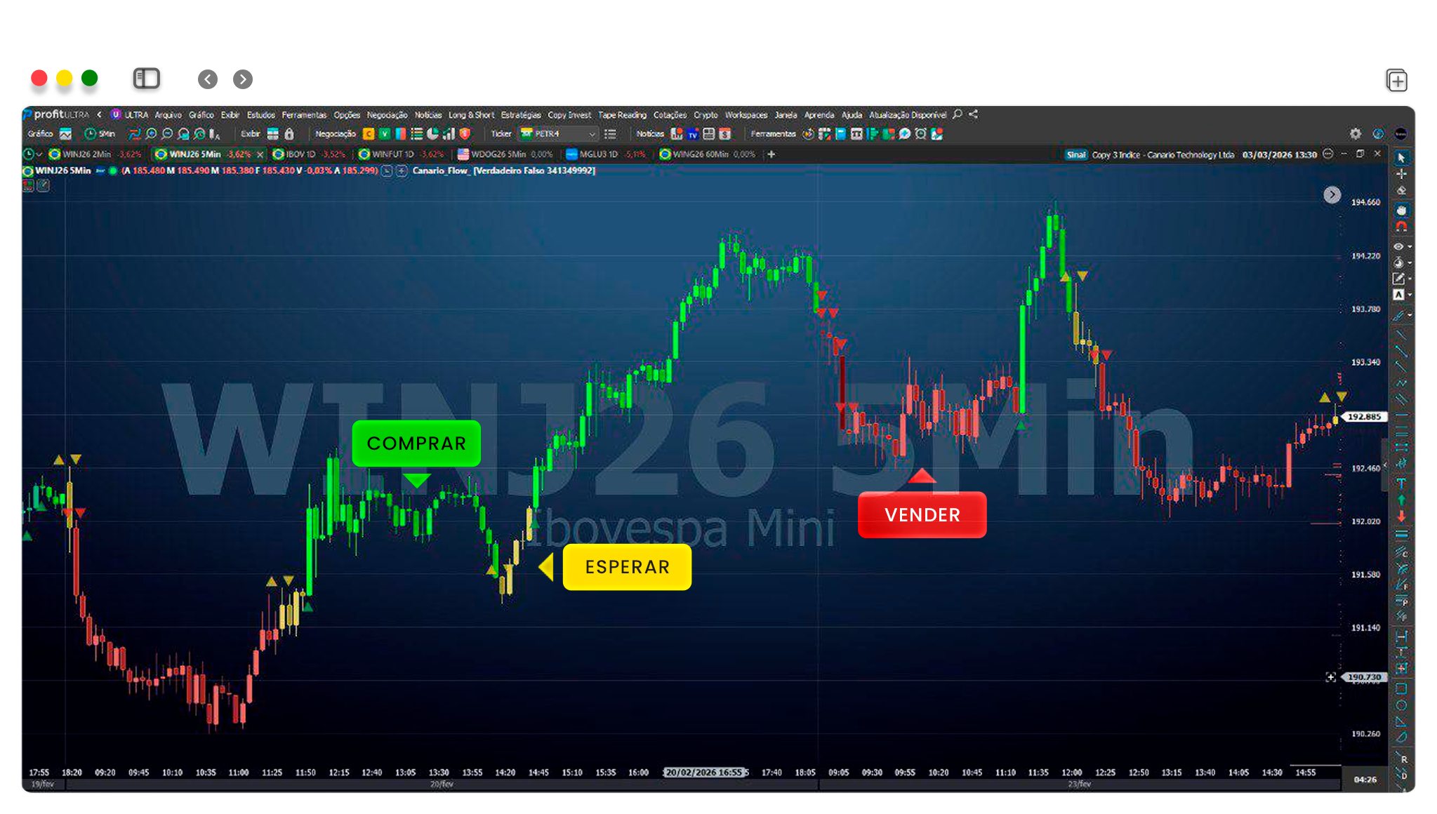 O indicador realiza a leitura do fluxo de ordens diretamente do Times and Trades da plataforma de negociação.